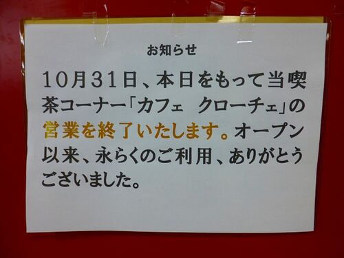 ジュンク堂西宮北口店で1時間ほど徘徊して、ちょっと一休みと南側奥の喫茶コーナー[CROCE]に寄ったら、なんと先月末で閉店!ジュンク堂のなかで数少ない喫茶コーナーを有する店舗だっただけに、とても残念です。 円弧状のカウンターで、ゆっくりコーヒーを…