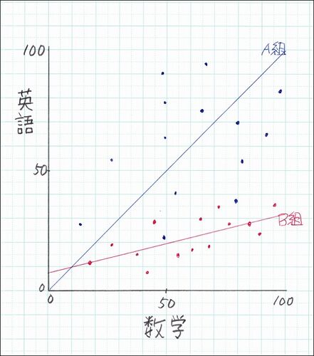 共通テストを受ける高3生と、その対策を始めています。 たまたまでしょうか、最近生徒たちが同じような間違いをしていました。 数学Ⅰの「データの分析」の単元で、相関係数についての誤解です。 例として、下図のような得点分布をするA組とB組。 A組のほ…